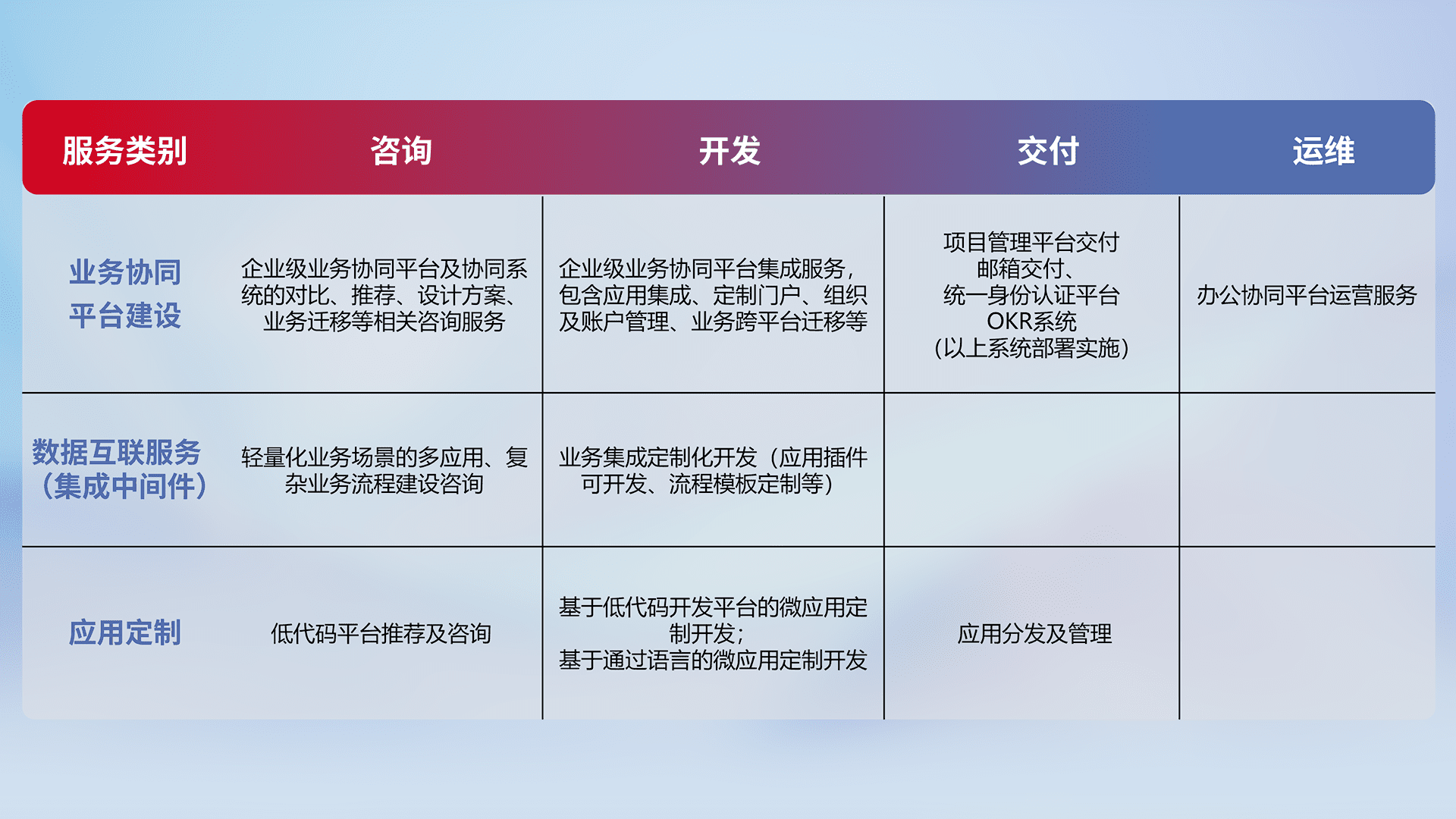 针对钉钉、、、、企微、、、IDaas等平台级产品提供产品的规划、、方案、、、交付、、定制化开发等服务,,实现如统一协同办公、、、、智能客户服务、、、混合会议管理、、、、智能数据查询、、等业务场景,,,实现数字化转型。。。